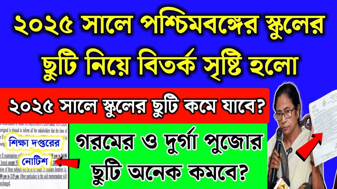 ২০২৫ সালের স্কুল ছুটিকে (School Holiday 2025 West Bengal) নিয়েই তৈরি হয়েছে নানান মতবাদ। বিভিন্ন শিক্ষা সংগঠনের অধিকর্তা নানান বক্তব্য পেশ করেছেন। একদলের মতে আগে বামফ্রন্টের আমলে সারা বছরে ৮৫ দিন স্কুল ছুটি থাকতো। কিন্তু বর্তমানে সেই ছুটি কমে গেছে। অনেকে চাইছে গরমের ছুটি না কমিয়ে গরমের ছুটি কেউ প্রায় একমাস দেওয়া হোক।
